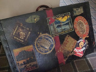 I like to collect travel items too, but my passion is for old leather trunks and suitcases that have been covered in colorful graphic stickers from the places that the owner had traveled. I have two in my "new" collection that I cannot part with, but wanted to share with you.I love the fact that every single label must have held many great memories for that traveler. Doesn't it make you wonder who they were and how wonderful it must have been to live a life where they were able to afford a vacation in far away places? Especially during a time when only books or radio shows told the stories of distant lands .... a time when the touch of a computer button or TV knob was never even imagined?